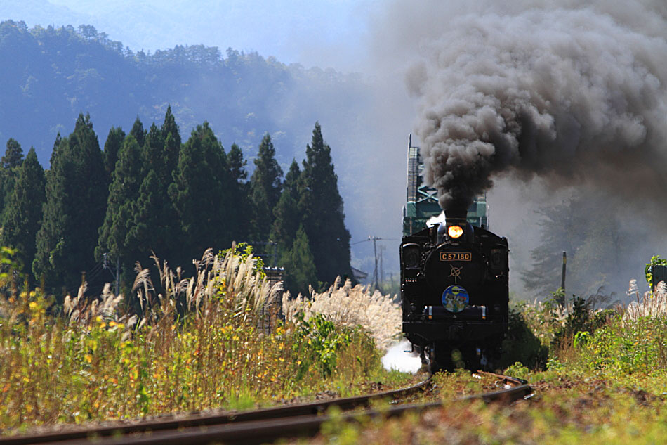 2014年のばんえつ物語号は機関車C57180号の全般検査のため、9月末で運転終了となる。夏の大雨で大幅に運転に数が減り、撮影も思うようにできなかったため、先々週に引き続き出かけることにした。幸い台風一過で風は強いものの、すがすがしい秋の空のもと、力いっぱい走る180号機を見ることができた。リフレッシュして再会を期待したい