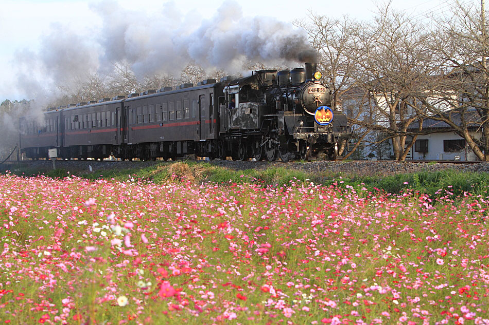 秋も深まり寒くなってきた、北真岡の線路わきに咲いているコスモスが見ごろになるかと思い出かけた。春は菜の花を楽しませてもらい沿線を花で飾る地元の方の心意気に感謝する。合わせて最近日本でも賑やかになってきたハロウィーン時期と重なり、カボチャのお化けのヘッドマークでSLの中も仮装で盛り上がっていた