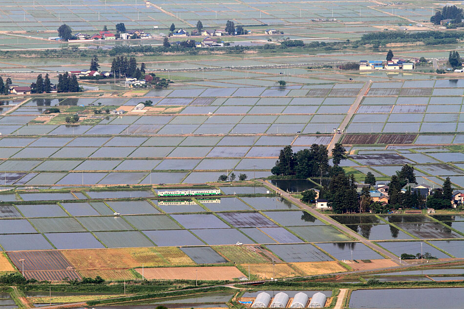 初日最後のショットは山の上から会津高田に向かう姿を撮る、会津盆地に水田が広がる
