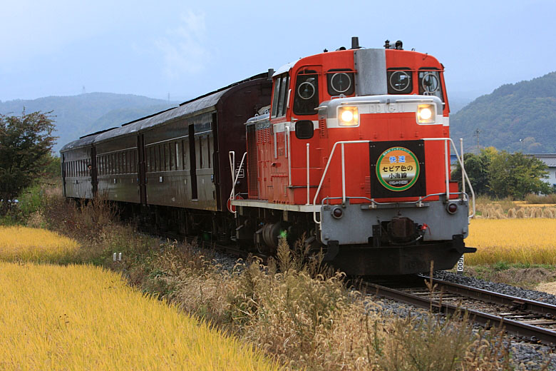 「セピア色の小海線」DD16+旧客3両で走る秋の臨時列車。この路線でこの列車は良い絵になると思い、寒くなった秋に出かけることにした。天気がいまひとつ良くなかったため八ヶ岳、南アルプスをバックに撮ることはできなかったが、山はすでに紅葉しておりすばらしい写真を撮ることができた